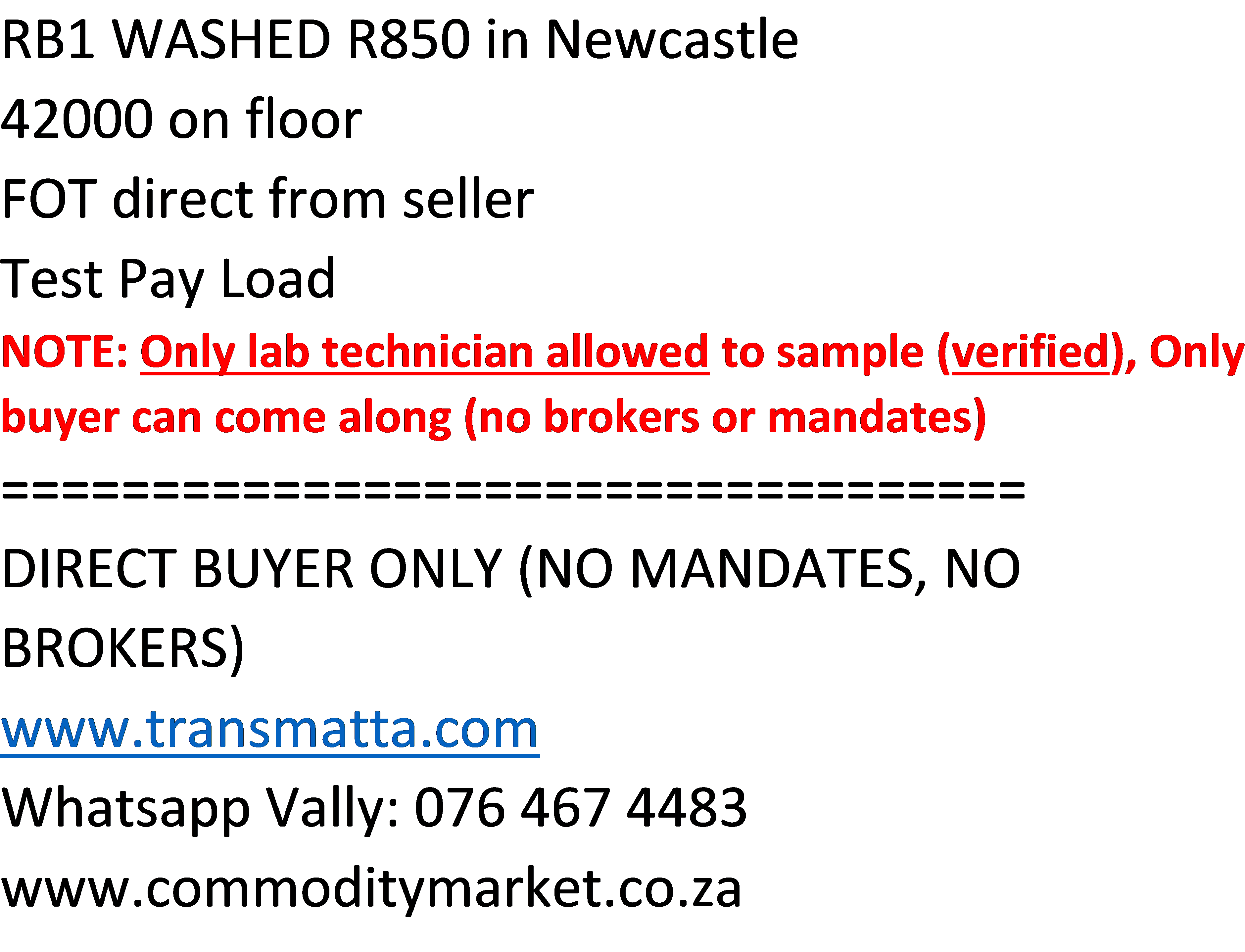 RB1 WASHED R850 in Newcastle 42000 on floor FOT direct from seller Test Pay Load NOTE: Only lab technician allowed to sample (verified), Only buyer can come along (no brokers or mandates) ================================== DIRECT BUYER ONLY (NO MANDATES, NO BROKERS) www.transmatta.com Whatsapp Vally: 076 467 4483 www.commoditymarket.co.za Vally: 076 467 44832023-08-21 12:15:13 |
