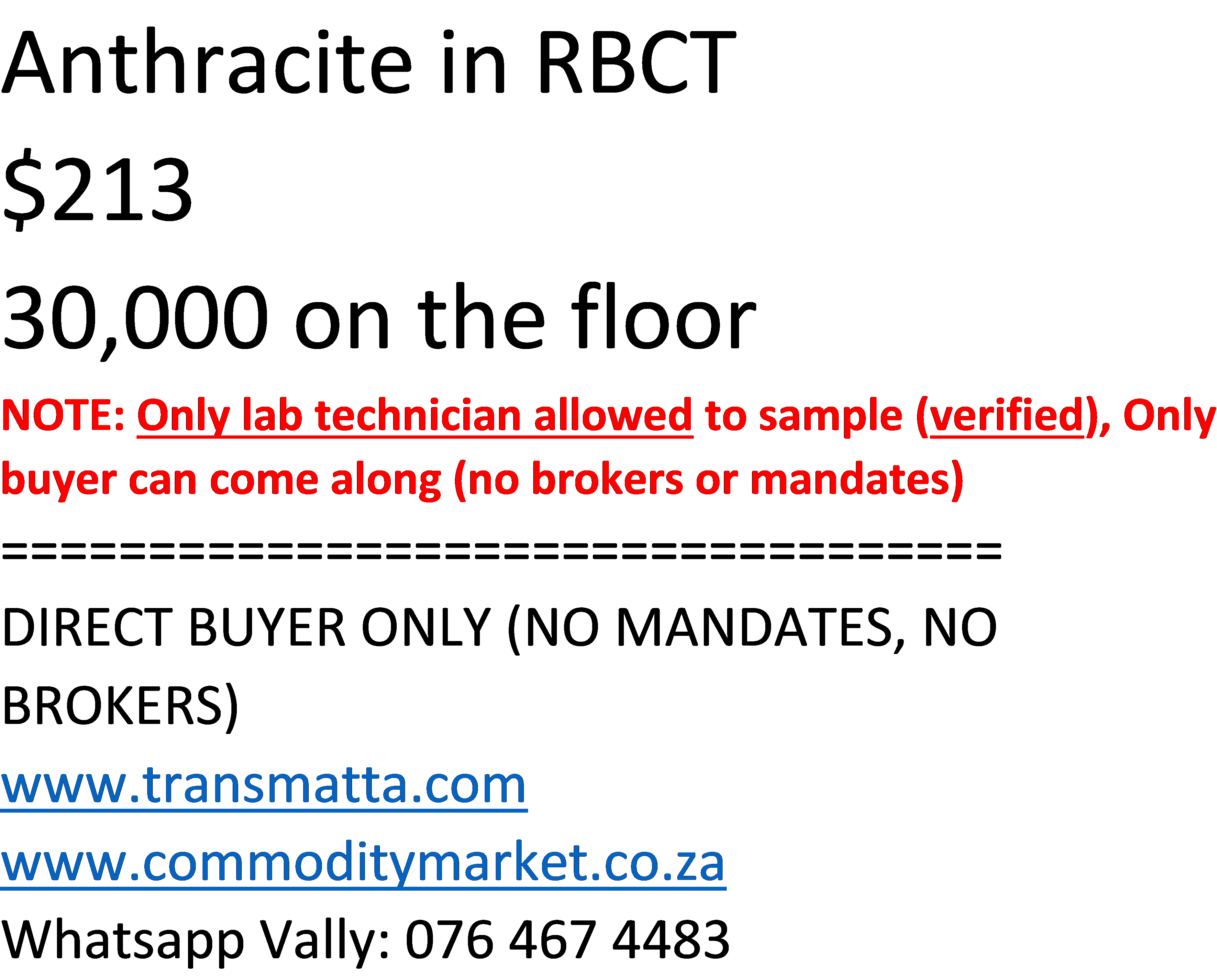 Anthracite in RBCT $213 30,000 on the floor NOTE: Only lab technician allowed to sample (verified), Only buyer can come along (no brokers or mandates) Vally: 076 467 44832023-08-22 13:26:52 |