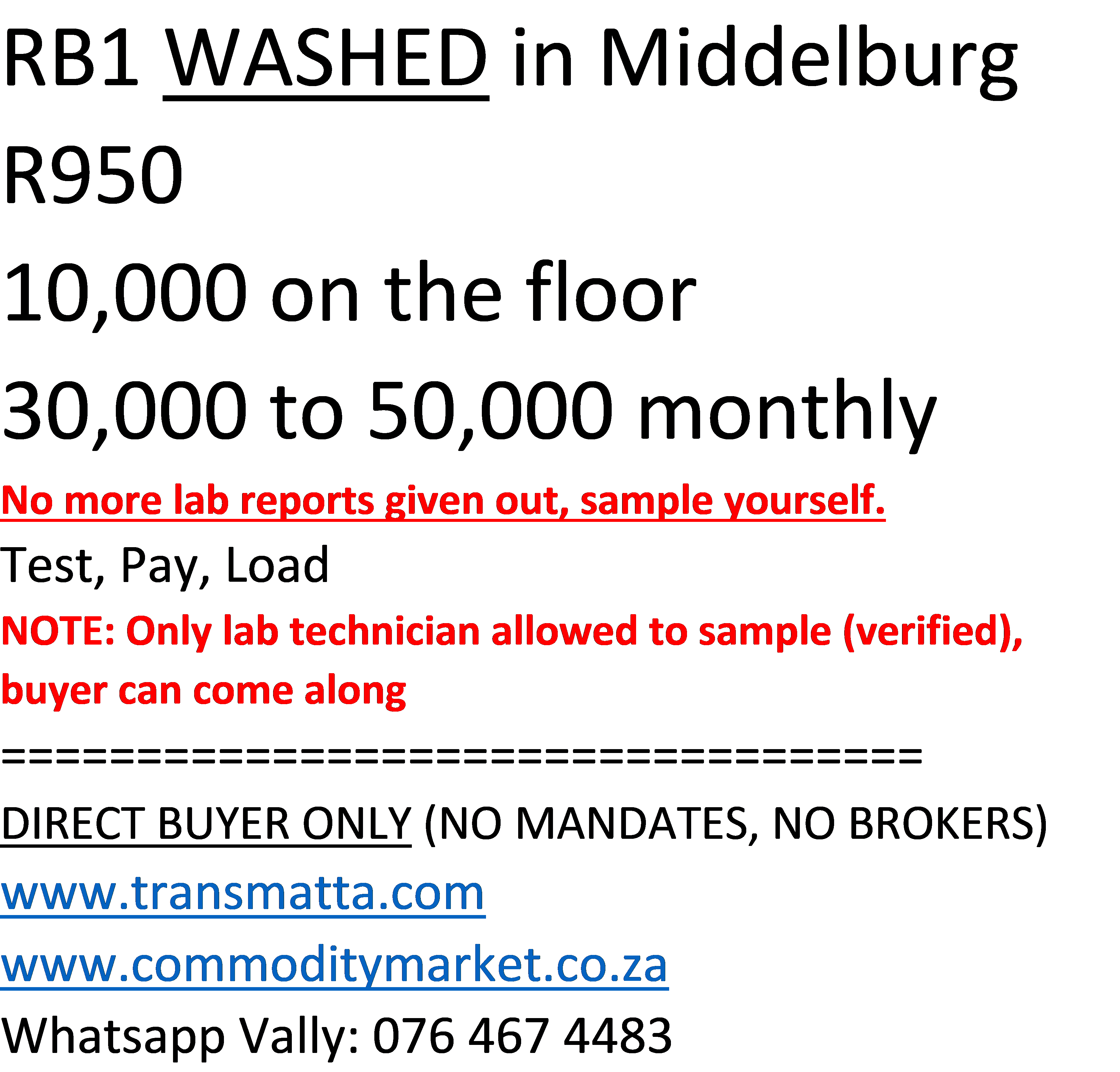 RB1 WASHED in Middelburg R950 10,000 on the floor 30,000 to 50,000 monthly No more lab reports given out, sample yourself. Test, Pay, Load NOTE: Only lab technician allowed to sample (verified), buyer can come along ================================== DIRECT BUYER ONLY (NO MANDATES, NO BROKERS) www.transmatta.com www.commoditymarket.co.za Vally: 076 467 44832023-08-26 01:55:35 |