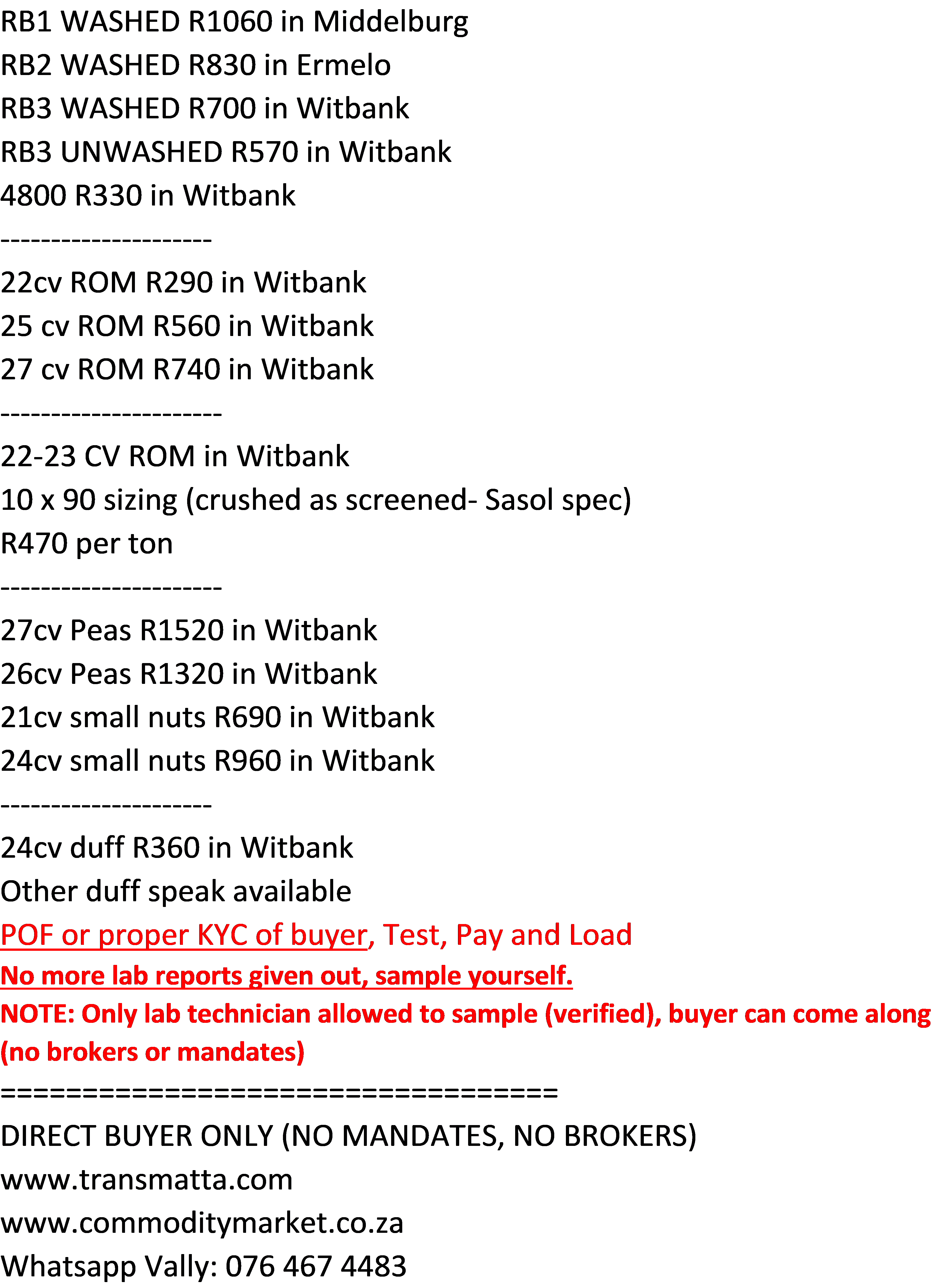 RB1 WASHED R960 in Witbank ONLY 1,000 tons on floor at this price No more lab reports given out, sample yourself. NOTE: Only lab technician allowed to sample (verified), buyer can come along (no brokers or mandates) ================================== DIRECT BUYER ONLY (NO MANDATES, NO BROKERS) www.transmatta.com www.commoditymarket.co.za Whatsapp Vally: 076 467 4483 Vally: 076 467 44832023-09-13 06:17:08 |